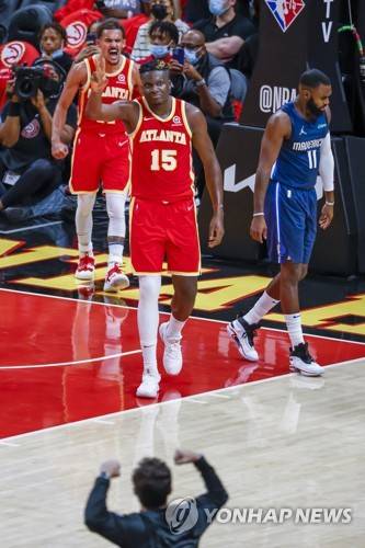 epa09538117 Atlanta Hawks center Clint Capela (C) of Switzerland and Atlanta Hawks guard Trae Young (L) reacts against Dallas Mavericks forward Tim Hardaway Jr. (R) during the second half of the NBA basketball game between the Dallas Mavericks and the Atlanta Hawks at State Farm Arena in Atlanta, Georgia, USA, 21 October 2021. EPA/ERIK S. LESSER SHUTTERSTOCK OUT