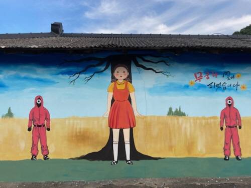 벽화는 최근 화제가 되는 넷플릭스 드라마 오징어 게임의 한 장면인 '무궁화꽃이 피었습니다'와 '달고나 뽑기'를 주제로 해 더욱 주목을 받고 있다.