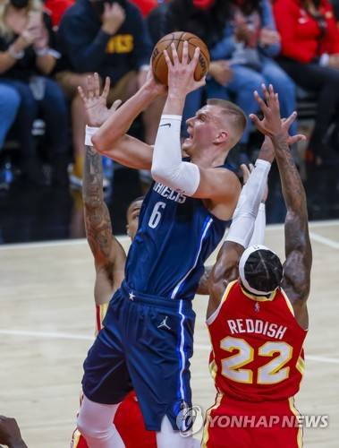 epa09538121 Dallas Mavericks center Kristaps Porzingis (L) of Latvia in action against Atlanta Hawks forward Cam Reddish (R) during the second half of the NBA basketball game between the Dallas Mavericks and the Atlanta Hawks at State Farm Arena in Atlanta, Georgia, USA, 21 October 2021. EPA/ERIK S. LESSER SHUTTERSTOCK OUT