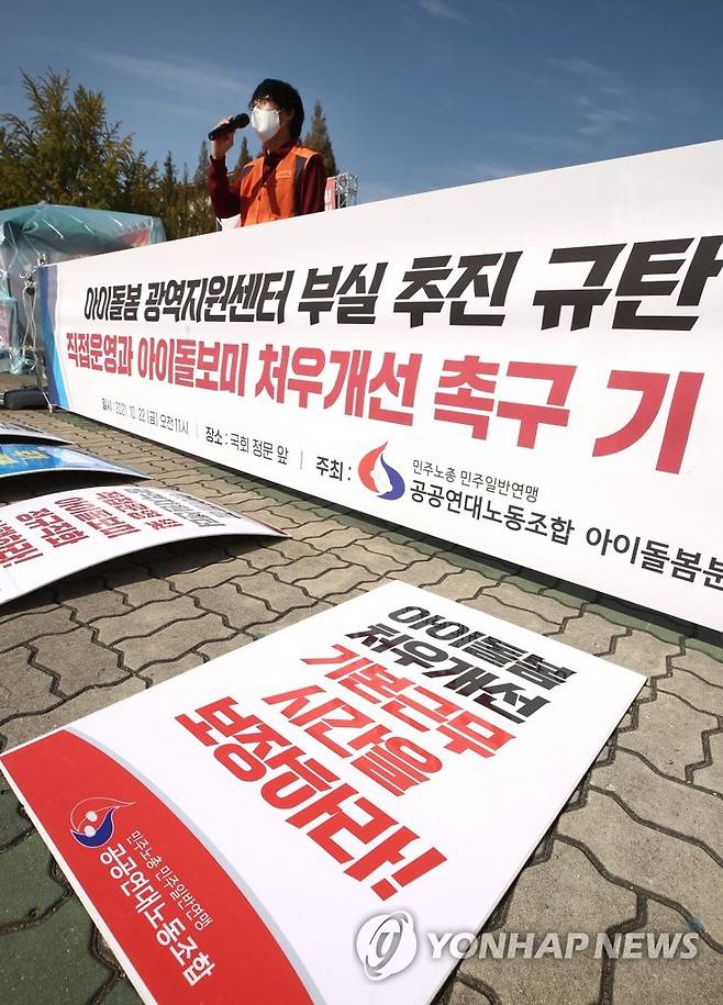 (서울=연합뉴스) 진연수 기자 = 이봉근 공공연대노동조합 정책국장이 22일 오전 서울 영등포구 국회의사당 앞에서 열린 아이돌봄 광역지원센터 부실 추진 규탄 및 직접운영 아이돌보미 처우개선 촉구 기자회견에서 발언하고 있다. 2021.10.22