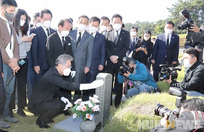 [광주=쿠키뉴스] 신영삼 기자 =더불어민주당 대선 후보인 이재명 경기도지사가 22일 오전, 김영록 전남도지사 등과 함께 광주 국립 5·18 민주묘지를 참배했다.[사진=전남도]