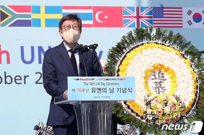 (부산=뉴스1) 여주연 기자 = 박형준 부산시장이 22일 오전 부산 남구 유엔기념공원에서 열린 '제76주년 유엔의 날 기념식'에서 기념사를 하고 있다. 2021.10.22/뉴스1