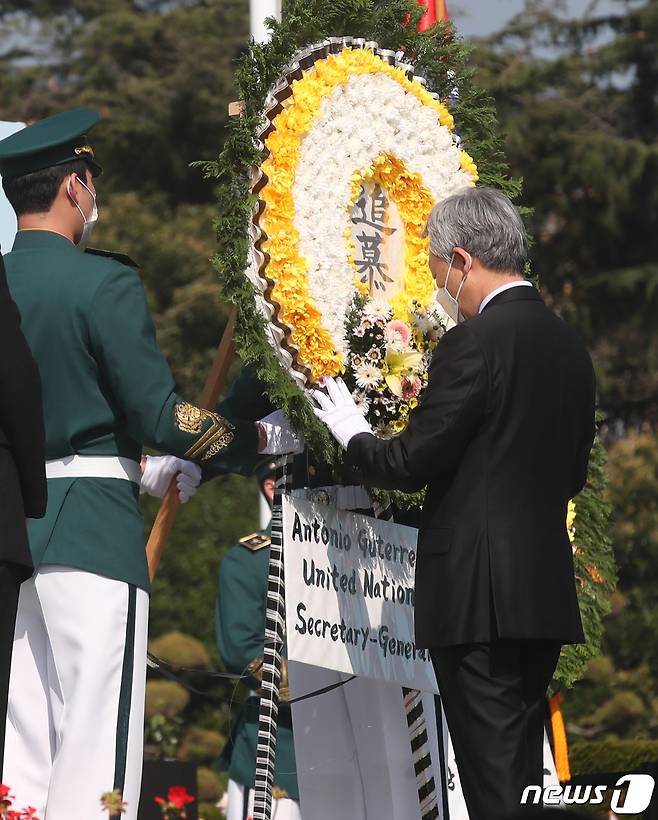 (부산=뉴스1) 여주연 기자 = 유엔기념공원관리처장 대행이 22일 오전 부산 남구 유엔기념공원에서 열린 '제76주년 유엔의 날 기념식'에서 UN사무총장 대리헌화를 하고 있다. 2021.10.22/뉴스1