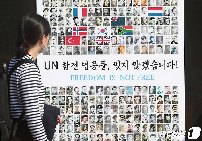 (부산=뉴스1) 여주연 기자 = 22일 오전 부산 남구 유엔기념공원에서 열린 '제76주년 유엔의 날 기념식'을 찾은 참석자가 전몰용사 388명의 사진으로 제작된 현수막 앞을 지나고 있다. 2021.10.22/뉴스1
