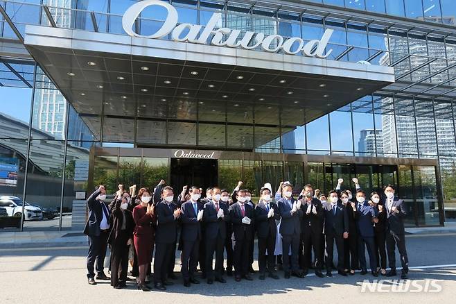 [인천=뉴시스] 김동영 기자 = 22일 오전 인천 연수구 송도국제도시 오크우드 프리미어 인천에서 심영철 오크우드 프리미어 인천 총지배인, 주시보 ㈜포스코인터내셔널 사장, 조윤영 한무컨밴션㈜ 사장, 더불어민주당 정일영 국회의원, 민민홍 인천관광공사 사장 ,이임혁 인천시관광협회 회장, 호텔 관계자들이 기념촬영을 하고 있다. 2021.10.22. dy0121@newsis.com
