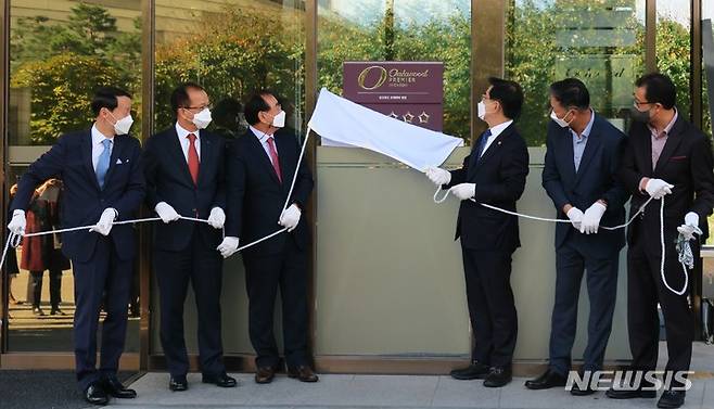 [인천=뉴시스] 김동영 기자 = 22일 오전 인천 연수구 송도국제도시 오크우드 프리미어 인천에서 심영철 오크우드 프리미어 인천 총지배인, 주시보 ㈜포스코인터내셔널 사장, 조윤영 한무컨밴션㈜ 사장, 더불어민주당 정일영 국회의원, 민민홍 인천관광공사 사장 ,이임혁 인천시관광협회 회장(왼쪽부터) 등이 현판식을 하고 있다. 2021.10.22. dy0121@newsis.com