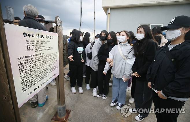 (제주=연합뉴스) 변지철 기자 = 22일 오전 제주시 한림읍 한수리 해안가에서 한림여중 1학년 학생들을 대상으로 자유학기제 프로그램인 현장 답사 '작가와 함께하는 제주신화'가 진행되고 있다. 2021.10.22