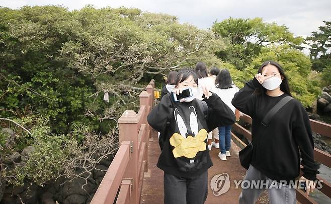 (제주=연합뉴스) 변지철 기자 = 22일 오전 제주시 한림읍 한수리 해안가에서 한림여중 1학년 학생들을 대상으로 자유학기제 프로그램인 현장 답사 '작가와 함께하는 제주신화'가 진행되고 있다. 2021.10.22