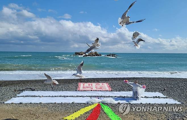 (경주=연합뉴스) 22일 경북 경주시 문무대왕면 봉길리 문무대왕릉 앞 봉길해수욕장에서 서예가 김동욱 씨와 이희숙 한국고살풀이춤보존회장이 독도의 날(10월 25일)을 앞두고 서예 퍼포먼스를 하고 있다. 2021.10.22 [김동욱 씨 제공. 재판매 및 DB 금지]