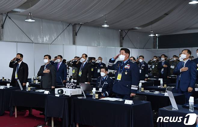 (서울=뉴스1) = 22일 경기도 성남시 서울ADEX 2021 행사장에서 열린 '제8회 공군 발전 세미나'에서 박인호 공군참모총장 등 참석자들이 국기에 대한 경례를 하고 있다. (공군 제공) 2021.10.22/뉴스1