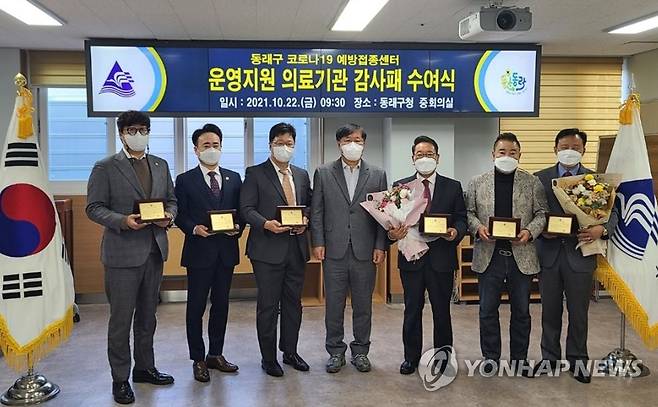 (서울=연합뉴스) 김우룡 부산 동래구청장(왼쪽 네 번째)이 22일 구청에서 관내 코로나19 예방접종센터 운영지원 의료기관 6개소 관계자에 감사패를 수여했다고 기념 촬영을 하고 있다. 2021.10.22