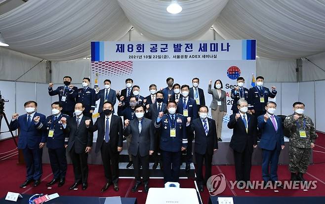(서울=연합뉴스) 박인호 공군참모총장(맨 앞줄 왼쪽 여섯 번째)이 22일 경기도 성남 서울공항 내 서울ADEX 2021 행사장에서 열린 '제8회 공군 발전 세미나'에서 참석자들과 기념 촬영을 하고 있다. 2021.10.22