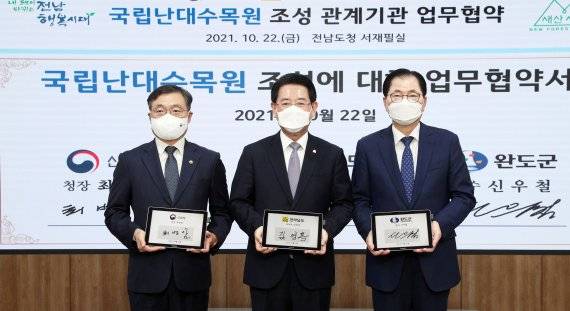 22일 전남도에 따르면 이들 3개 기관은 이날 전남도청에서 김영록 전남도지사, 최병암 산림청장, 신우철 완도군수, 윤재갑 국회의원 등이 참석한 가운데 '국립난대수목원 조성 업무협약'을 체결했다.