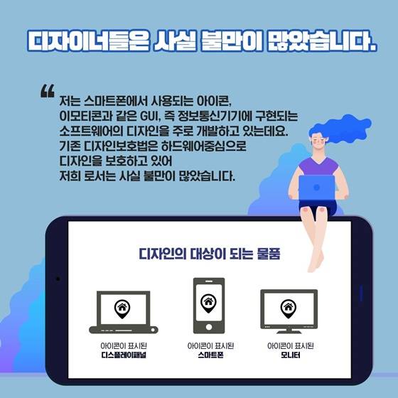 - “저는 스마트폰에서 사용되는 아이콘, 이모티콘과 같은 GUI(Graphic User Interface : 그래픽사용자인터페이스), 즉 정보통신기기에 구현되는 소프트웨어의 디자인을 주로 개발하고 있는데요. 기존 디자인보호법은 하드웨어중심으로 디자인을 보호하고 있어 저희로서는 사실 불만이 많았습니다.”