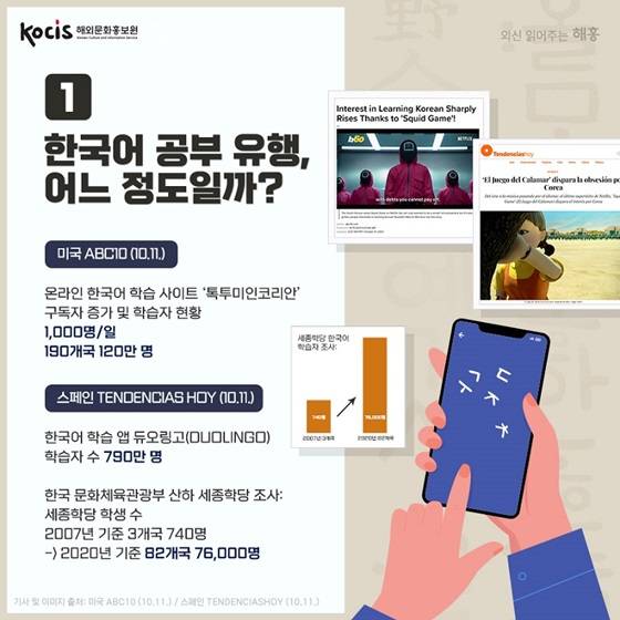유행작 ‘오징어 게임’의 방영 이후 한국어 공부에 대한 관심이 급증했다. 한국어 학습은 ‘세계적 현상’이며 멋진 여가활동이 됐다. _영국 REUTERS(10.11.)