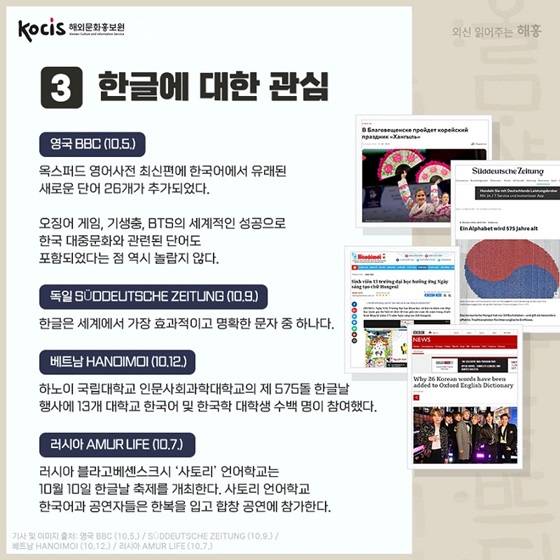 "주인도한국문화원은 한국어 강좌를 제공하고 있는데 자리가 너무 빨리 찬다." _인도 NEW INDIAN EXPRESS(10.2.) 최근 일본에서는 카페나 전철 안에서 한국어 학습서를 손에 들고 있는 사람이 자주 눈에 띈다.
