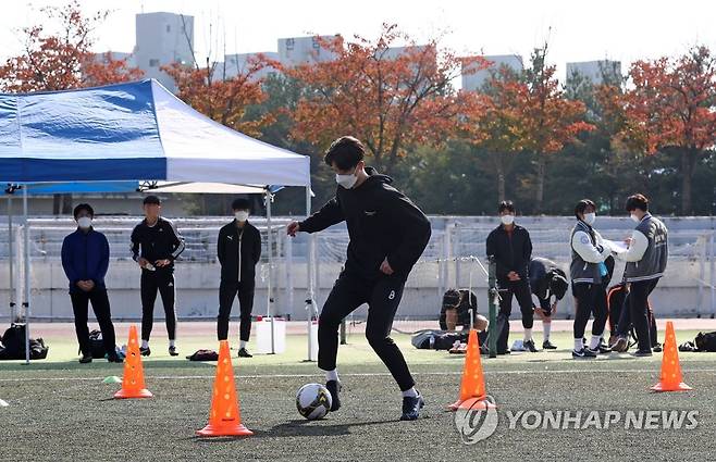 (대전=연합뉴스) 김준범 기자 = 22일 오후 대전시 대덕구 오정동 한남대학교에서 열린 2022학년도 수시모집 체육 실기고사에서 응시생들이 축구 실력을 평가받고 있다. 2021.10.22