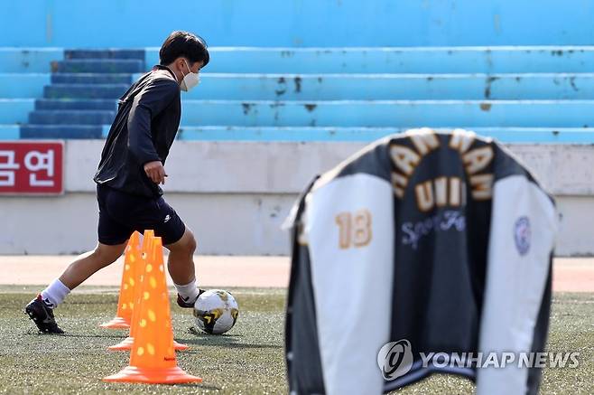 (대전=연합뉴스) 김준범 기자 = 22일 오후 대전시 대덕구 오정동 한남대학교에서 열린 2022학년도 수시모집 체육 실기고사에서 응시생들이 축구 실력을 평가받고 있다. 2021.10.22