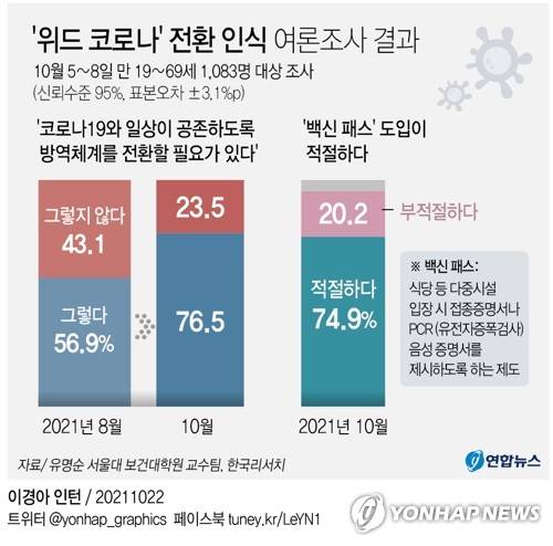이번 조사를 보면 1천83명 가운데 76.5%가 '코로나19와 일상이 공존하도록 방역체계를 전환할 필요가 있다'고 답했다. 56.9%였던 지난 8월 조사 때보다 19.6%포인트 증가했다.