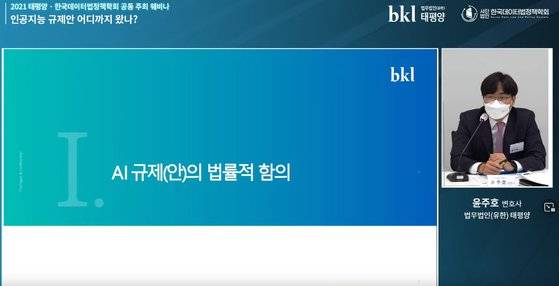 두 번째 연사로는 태평양 윤주호 변호사가 나섰다. 윤주호 변호사는 ‘국내 AI 법제의 현황, 이슈와 향후 과제’라는 주제의 발표를 했다. 윤주호 변호사는 “현재 우리나라는 AI 규제를 위한 일반법은 존재하지 않지만 간접적 규정을 통해 규제하고 있는 상황”이라고 말했다.