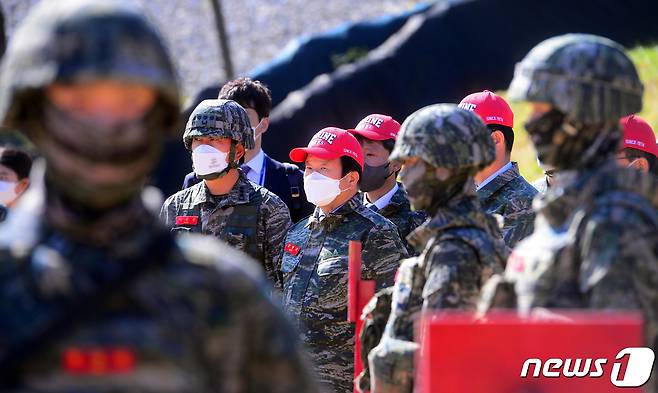 (연평도=뉴스1) 국회사진취재단 = 박병석 국회의장이 22일 인천 옹진군 연평도 해병대 연평부대를 위문 방문해 작전대비태세 현황을 보고받고 있다. 2021.10.22/뉴스1