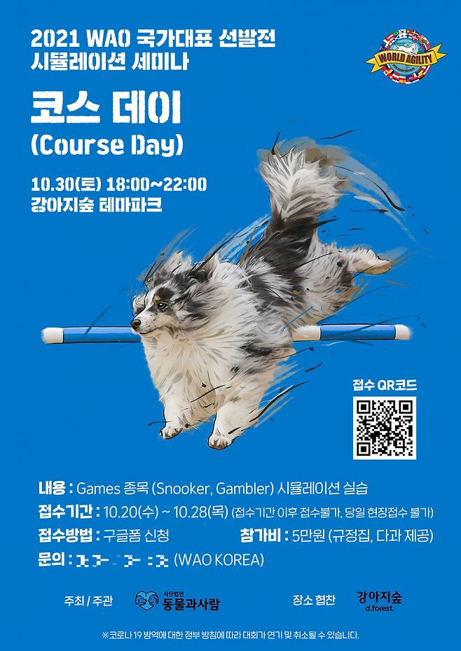 [헤럴드경제=조용직 기자] 보호자와 반려견이 함께 호흡하며 장애물을 통과하는 도그스포츠 ‘어질리티(Agility)’ 경기 대회인 ‘WAO(World Agility Open) 국가대표 선발전’이 오는 11월 13~14일 일 춘천 강아지숲에서 열린다. 이런 가운데 예비 출진자들이 변경된 룰과 경기운영 방식을 익힐 수 있는 코스데이가 이달 30일 같은 곳에서 열린다.