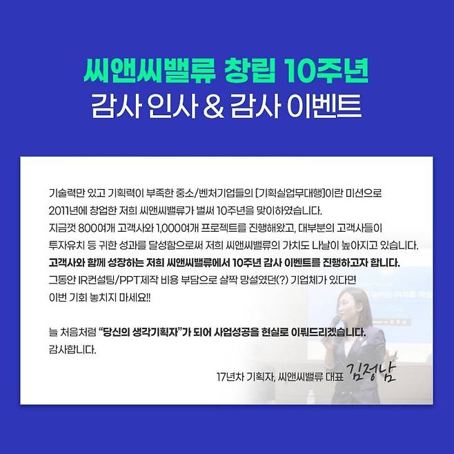 기업 성장단계별 비전과 목적에 맞춘 문서·기획 대행업체 씨앤씨밸류가 창립 10주년을 맞아 특별한 할인이벤트를 펼친다.