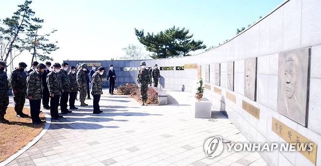 (인천=연합뉴스) 박병석 국회의장이 22일 서해 서북단 인천시 옹진군 연평도 연평부대를 방문, 평화공원 내 연평해전 전사자 추모비 앞에서 묵념하고 있다. 2021.10.22 [국회사진기자단]