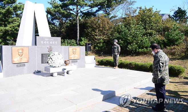 (인천=연합뉴스) 박병석 국회의장이 22일 서해 서북단 인천시 옹진군 연평도 연평부대를 방문, 평화공원 내 연평도 포격전 전사자 위령탑 앞에서 묵념하고 있다. 2021.10.22 [국회사진기자단]