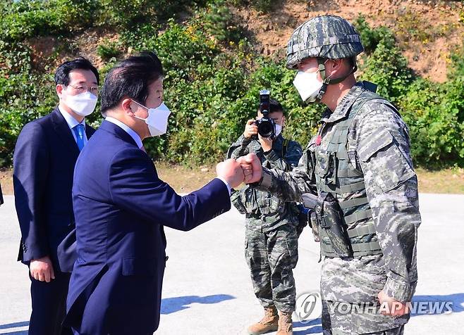 (인천=연합뉴스) 박병석 국회의장이 22일 서해 서북단 인천시 옹진군 연평도 연평부대를 방문, 해병대 이종문 연평부대장과 주먹인사를 하고 있다. 2021.10.22 [국회사진기자단]