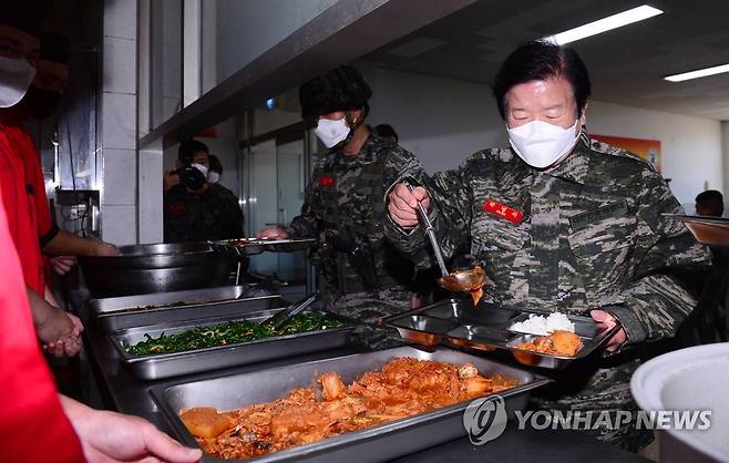 (인천=연합뉴스) 박병석 국회의장(가운데)이 22일 서해 서북단 인천시 옹진군 연평도 연평부대를 방문, 점심 식사를 배식 받고 있다. 2021.10.22 [국회사진기자단]