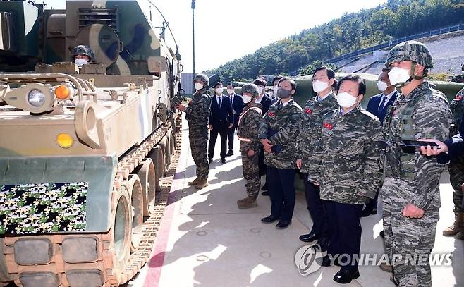 (인천=연합뉴스) 박병석 국회의장(왼쪽 세 번째)이 22일 서해 서북단 인천시 옹진군 연평도 연평부대를 방문, 전투장비 등을 살펴보고 있다. 2021.10.22 [국회사진기자단]