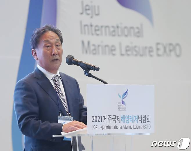 (서귀포=뉴스1) 오현지 기자 = 하민철 제주국제해양레저박람회 조직위원장이 22일 제주 서귀포시 국제컨벤션센터(ICC제주)에서 열린 2021 제주국제해양레저박람회 개막식에서 개회사를 하고 있다. 2021.10.22/뉴스1