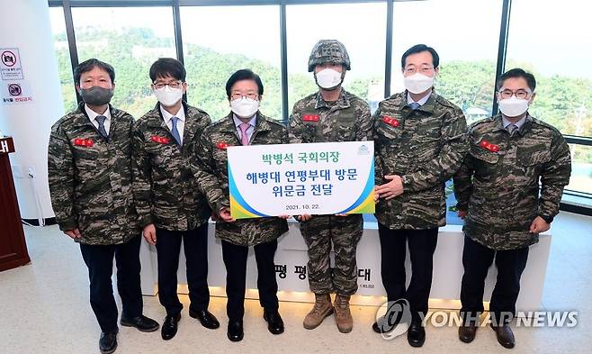 (인천=연합뉴스) 박병석 국회의장(왼쪽 세 번째)이 22일 서해 서북단 인천시 옹진군 연평도 연평부대를 방문, 이종문 연평부대장(오른쪽 세 번째)에게 위문금을 전달하고 있다. 2021.10.22 [국회사진기자단]