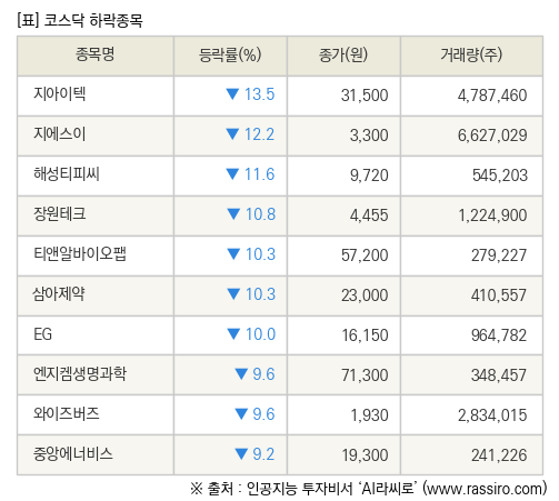 [fnRASSI]장마감, 코스닥 하락 종목(지아이텍 -13.5% ↓)