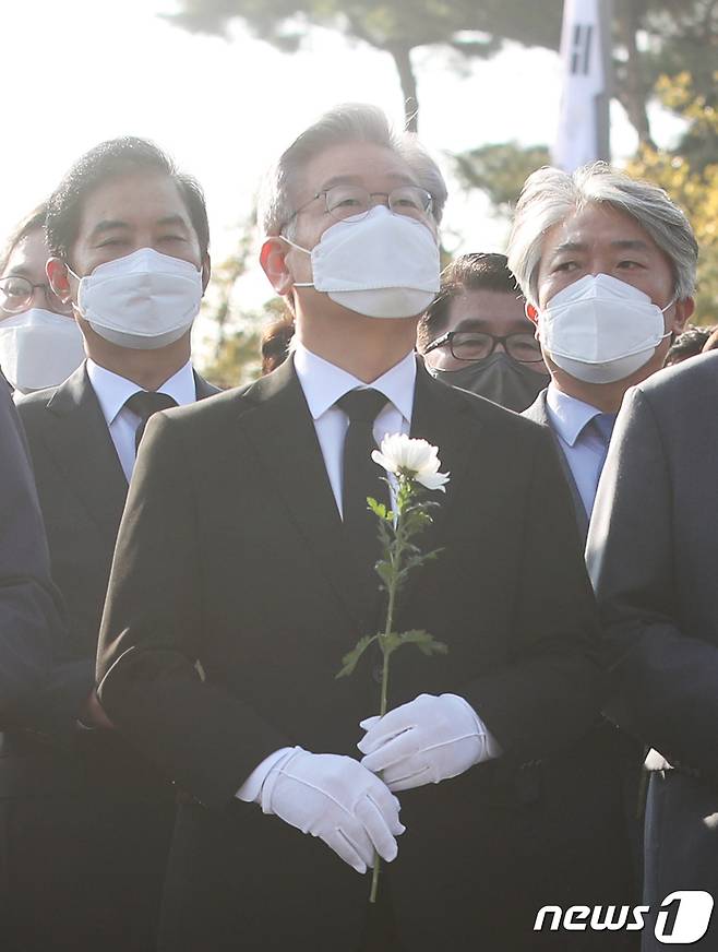 (김해=뉴스1) 여주연 기자 = 이재명 더불어민주당 대선 후보가 22일 오후 경남 김해시 봉하마을 故노무현 전 대통령 묘역을 찾아 헌화하고 있다. 2021.10.22/뉴스1