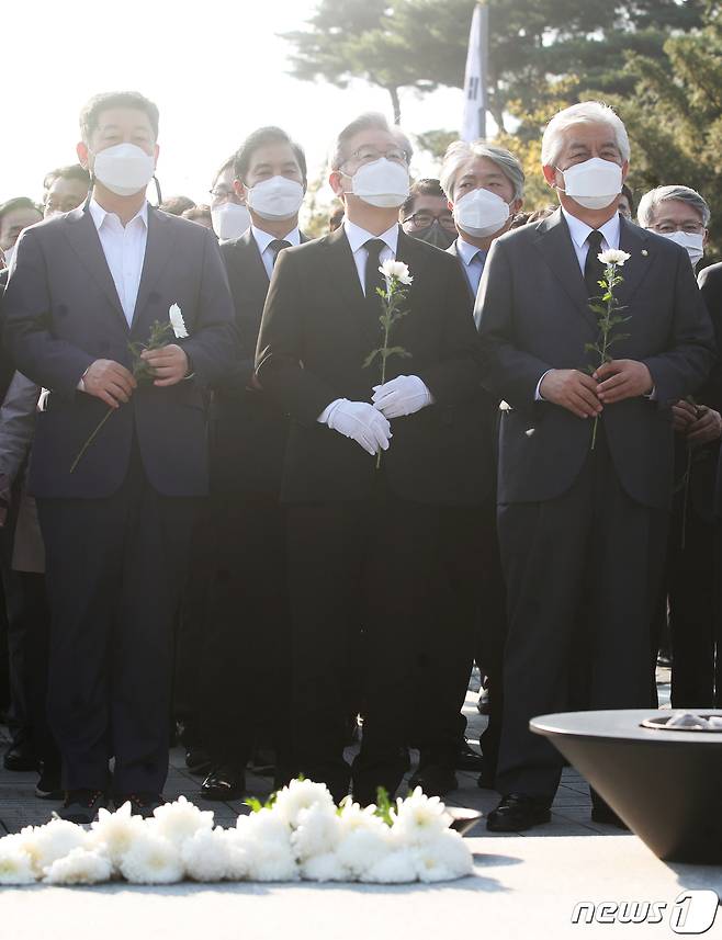 (김해=뉴스1) 여주연 기자 = 이재명 더불어민주당 대선 후보가 22일 오후 경남 김해시 봉하마을 故노무현 전 대통령 묘역을 찾아 헌화하고 있다. 2021.10.22/뉴스1