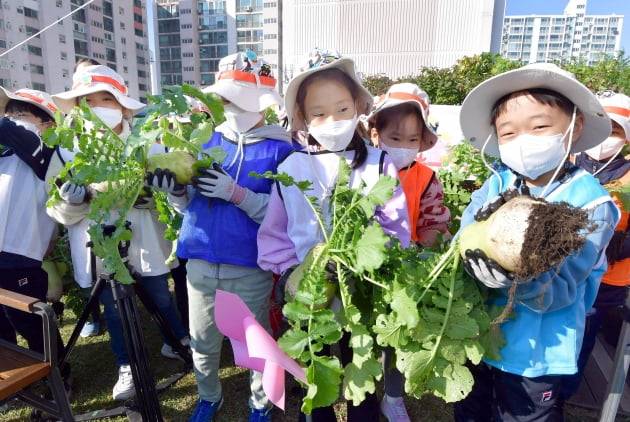 서울보라매초등학교가 22일 행복나눔축제 깍두기나눔 행사를 교내 하늘정원에서 열었다.학생들이 재배한 무를 수확하고 있다.