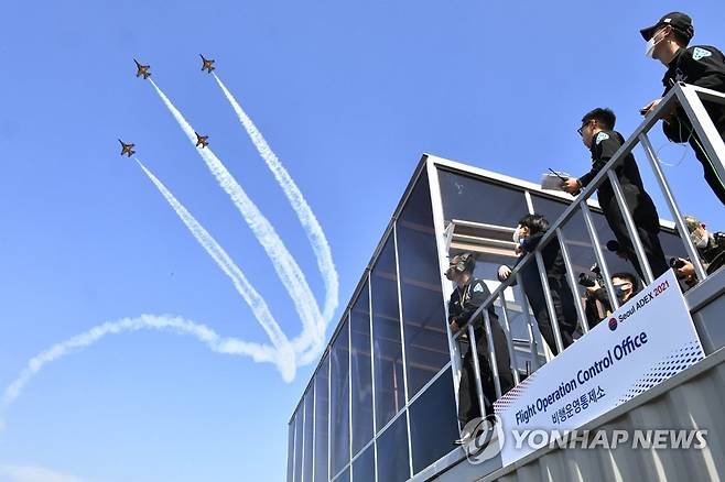 (서울=연합뉴스) 공군 특수비행팀 블랙이글스가 22일 '서울ADEX 2021'이 진행 중인 경기도 성남 서울공항에서 희귀 소아암으로 투병 중인 최윤수 군을 위한 특별 이벤트를 마련했다. 사진은 비행운영통제소에서 블랙이글스 요원들과 함께 에어쇼를 관람하는 최윤수 군(오른쪽 세 번째). 2021.10.22