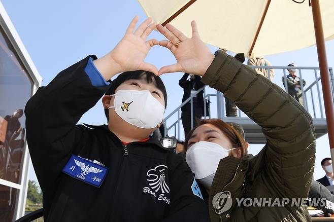 (서울=연합뉴스) 공군 특수비행팀 블랙이글스가 22일 '서울ADEX 2021'이 진행 중인 경기도 성남 서울공항에서 희귀 소아암으로 투병 중인 최윤수 군을 위한 특별 이벤트를 마련했다. 사진은 블랙이글스가 에어쇼에서 하트를 그리자 어머니와 손 하트를 만들어 보이는 최윤수 군. 2021.10.22