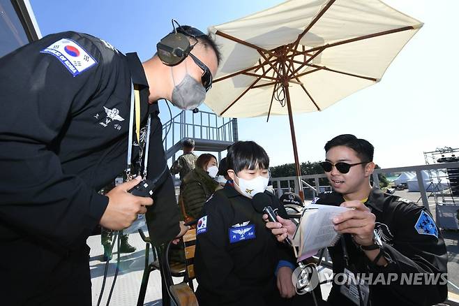 (서울=연합뉴스) 공군 특수비행팀 블랙이글스가 22일 '서울ADEX 2021'이 진행 중인 경기도 성남 서울공항에서 희귀 소아암으로 투병 중인 최윤수 군을 위한 특별 이벤트를 마련했다. 사진은 일일 블랙이글스 내레이터로 임명돼 직접 에어쇼 시작을 알리는 최윤수 군. 2021.10.22