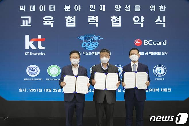 (서울=뉴스1) = KT가 22일 BC카드, 서울대학교 빅데이터 혁신공유대학 사업단과 빅데이터 분야의 신기술 인재양성과 이를 위한 교육 인프라 구축 등의 협력을 강화하는 내용의 협약을 체결했다. 왼쪽부터 신수정 KT 엔터프라이즈부문장(왼쪽부터), 김홍기 서울대학교 빅데이터사업단장, 변형균 BC카드 AI빅데이터본부장이 협약 기념촬영을 하고 있다. (KT 제공) 2021.10.22/뉴스1