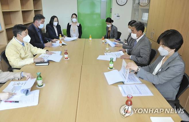 (서울=연합뉴스) 양성일 보건복지부 제1차관(맨 왼쪽)이 22일 오후 서울시 마포장애인종합복지관에서 현장 관계자들과 간담회 하고 있다. 2021.10.22