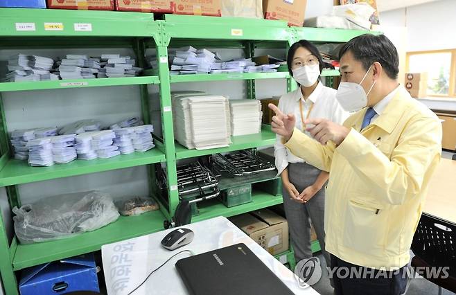 (서울=연합뉴스) 양성일 보건복지부 제1차관(오른쪽)이 22일 오후 서울시 마포장애인종합복지관을 방문해 코로나19에 대응한 방역 관리 사항을 점검하고 있다. 2021.10.22