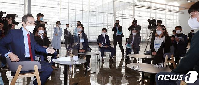 (김제=뉴스1) 유경석 기자 = 송하진 전북도지사가 22일 전북 김제시 스마트팜 혁신밸리 공사현장을 찾아 현장시찰을 마치고 예비 청년농들과 간담회를 하고 있다. 2021.10.22/뉴스1