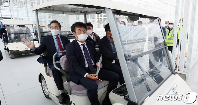 (김제=뉴스1) 유경석 기자 = 송하진 전북도지사(왼쪽)가 22일 전북 김제시 스마트팜 혁신밸리 공사현장을 찾아 현장시찰을 하고 있다. 2021.10.22/뉴스1