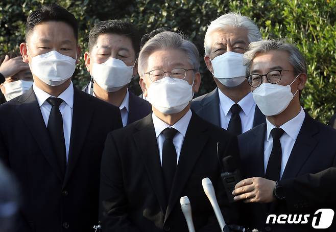 (김해=뉴스1) 여주연 기자 = 이재명 더불어민주당 대선 후보가 22일 오후 경남 김해시 봉하마을 故노무현 전 대통령 묘역 참배와 권양숙 여사 예방을 마친 후 취재진과 질의응답을 하고 있다. 2021.10.22/뉴스1