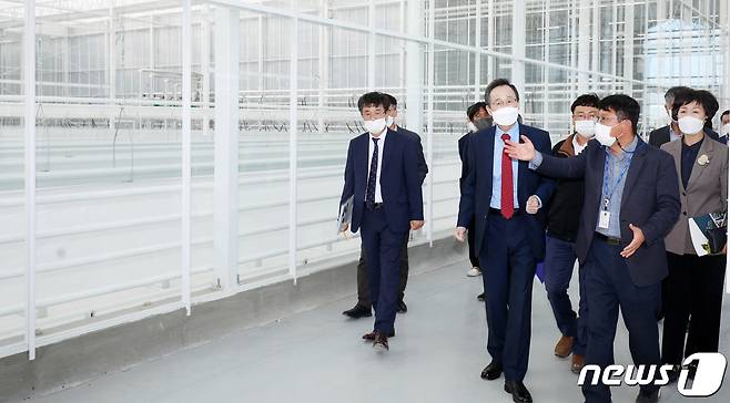 (김제=뉴스1) 유경석 기자 = 송하진 전북도지사가 22일 전북 김제시 스마트팜 혁신밸리 공사현장을 찾아 현장시찰을 하고 있다. 2021.10.22/뉴스1