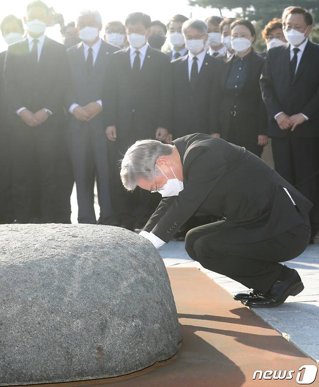 (김해=뉴스1) 여주연 기자 = 이재명 더불어민주당 대선 후보가 22일 오후 경남 김해시 봉하마을 故노무현 전 대통령 묘역을 찾아 너럭바위를 어루만지고 있다. 2021.10.22/뉴스1