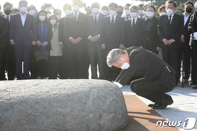 (김해=뉴스1) 여주연 기자 = 이재명 더불어민주당 대선 후보가 22일 오후 경남 김해시 봉하마을 故노무현 전 대통령 묘역을 찾아 너럭바위를 어루만지고 있다. 2021.10.22/뉴스1